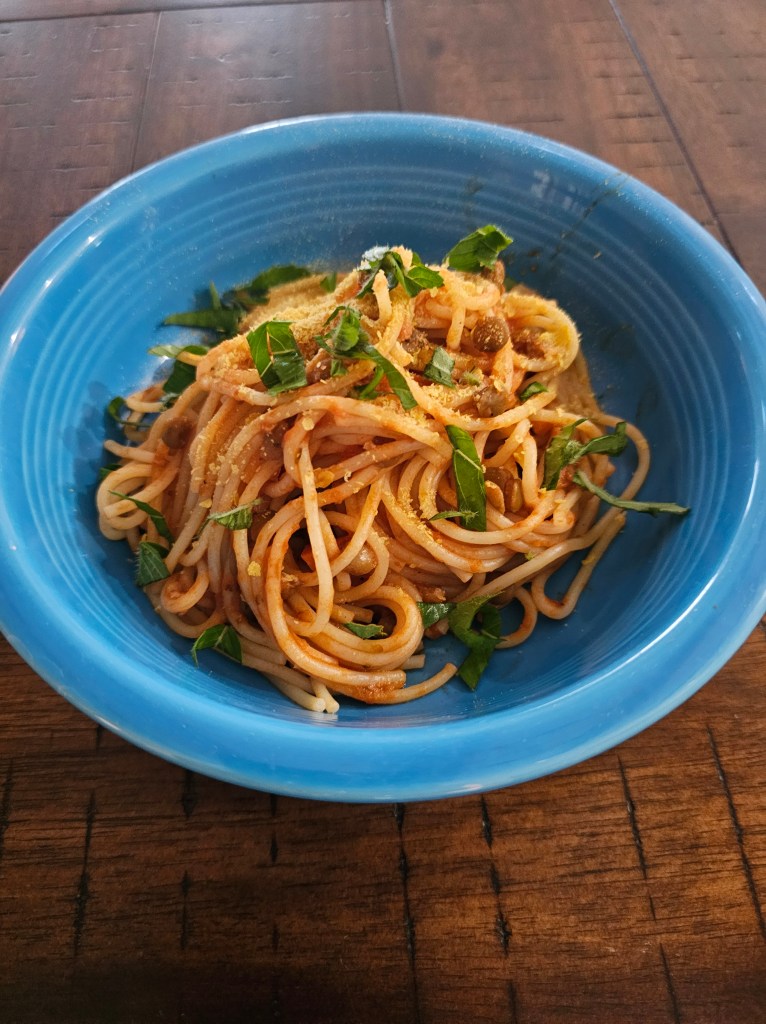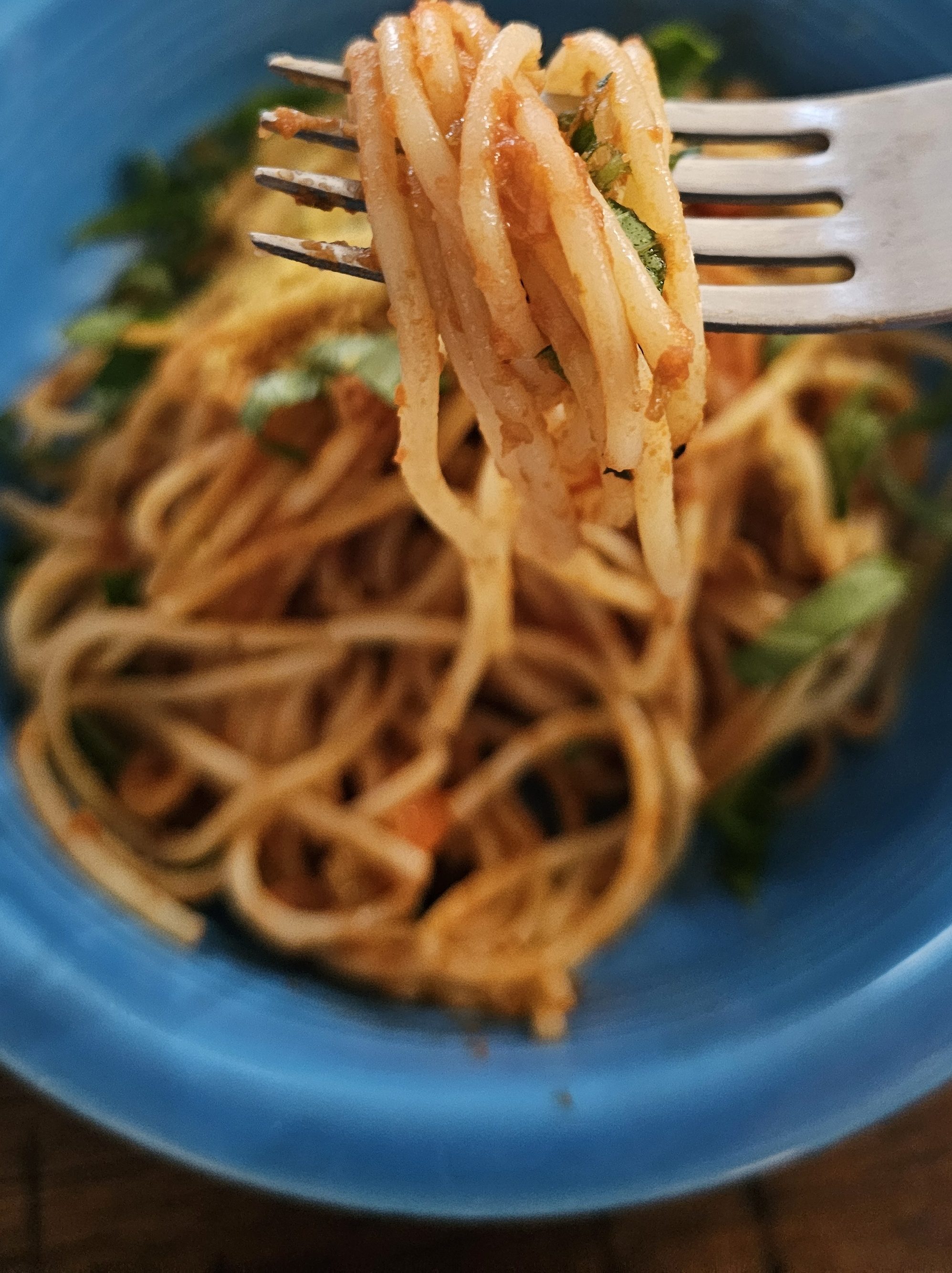 This pasta recipe is one made up by accident really… my girls (6yo & 3yo) wanted spaghetti on a night that I was low on pantry staples. I made this using what I had on hand at the time and also wanted it to be a quick easy meal. The crunchy mom that I am, I of course had to sneak in veggies and a source of protein, while also making it delicious!