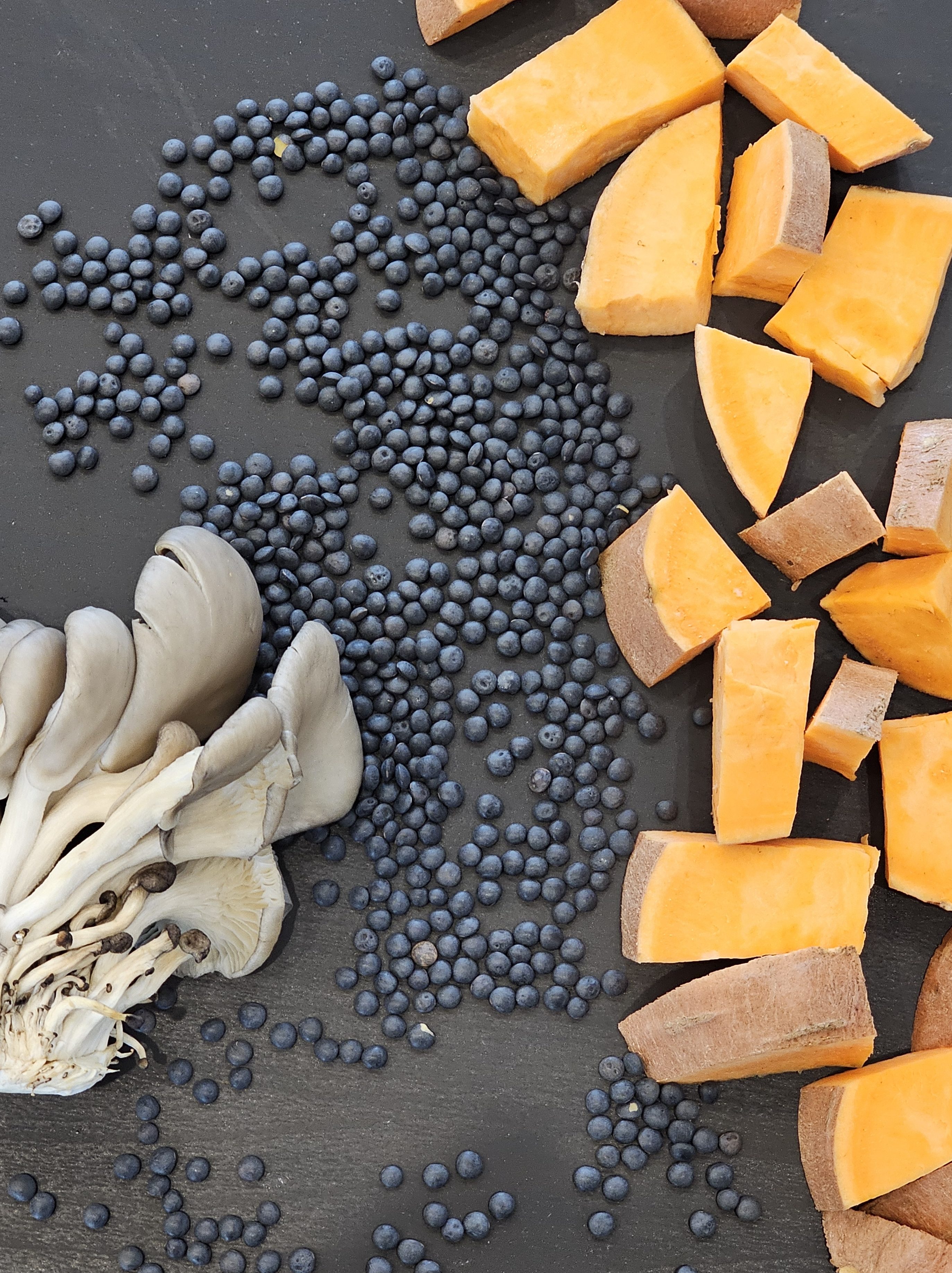 - Top the lentils with the roasted sweet potatoes, tofu, and mushrooms.